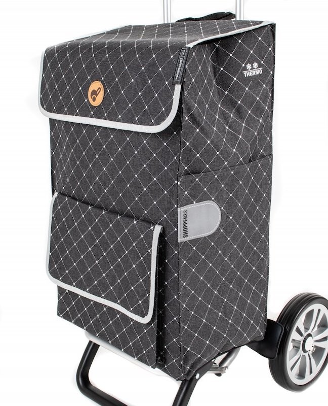 Den elegante Tamo indkøbstaske er grå med hvidt mønster og har to udvendige lynlåslommer og lommer på siderne. Tamo har indbygget kølerumm, som indeholder 8 liter og er perfekt til opbevaring af kølevarer indtil du kommer hjem. Tasken er fremstillet i yderst slidstærkt vandtæt nylon. Indvendigt har den et ekstra rum til din taske, eller andre løse genstande.