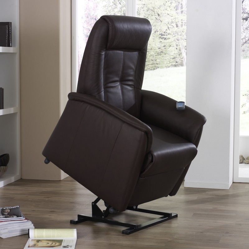 Himolla 9107 er en lækker otiumstol med løftefunktion og elektrisk regulering af ryglæn og fodstøtte. Fås i sort læder eller gråt stof.