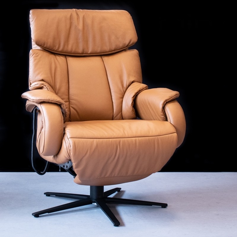 Himolla 7717 hvilestol med drejefod. Elegant løftestol med elektrisk regulering af ryglæn og fodstøtte. Fås i sort eller whisky læder.