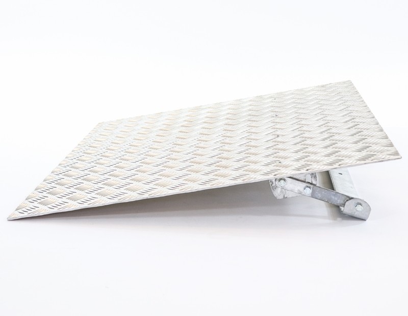 Solid terasserampe i aluminium med justérbar højde. Ramperne er fremstillet i kraftig skridsikker aluminiumsplade uden kanter, hvilket betyder, at den kan lægges helt ind til døren uden mellemrum.