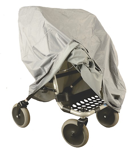 Overtræk til rollator i grå nylon, som beskytter rollatoren regn og støv, når den efterlades udendørs.